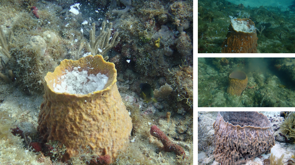 (Photo credits go to Liz Fromuth and Brian K. Walker). Among sessile marine invertebrates, X. muta, gets as “charismatic” as many other mobile marine metazoans: the sponge is sometimes called the “redwood of the reef”, with individuals growing quite large (sometimes more than 2 m wide and deep). Their lives can also span decades, and the species provides rugosity and multiple microhabitats for several Caribbean reefs that have lost many of their hard corals to disease and bleaching. X. muta‘s annual spawning of gametes can also appear conspicuously and dramatic, spraying high and wide into the water column.