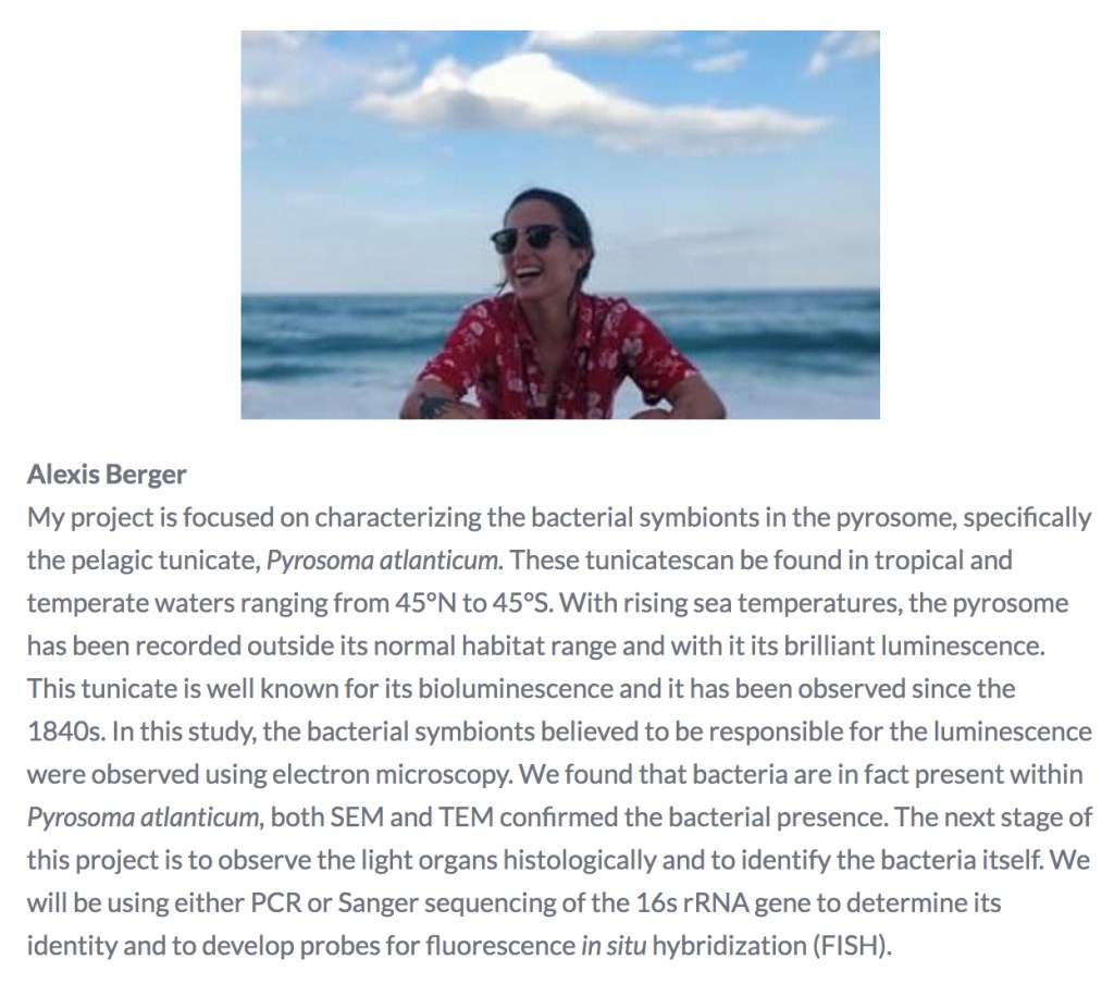 Past: Bachelor of Science in Biological Sciences with a minor in Chemistry; University of Pittsburgh Project: The primary focus of my project is to characterize the microbiome of deep-sea anglerfish using high-throughput sequencing techniques. Specifically. I am focus ing on the symbiotic bacterial community found with in the bioluminescent lures (esca) of these fish. My goal is to determine whether t here is a significant difference in the esca microbiome of various anglerfish genera. I will also be collecting information on the skin and intestinal microbiomes of these f ish for further analyses. This project is an offshoot of the DEEPEND Consortium which focuses on increasing our understanding of deep pelagic ecosystem of the northern Gulf of Mexico. Learn more…