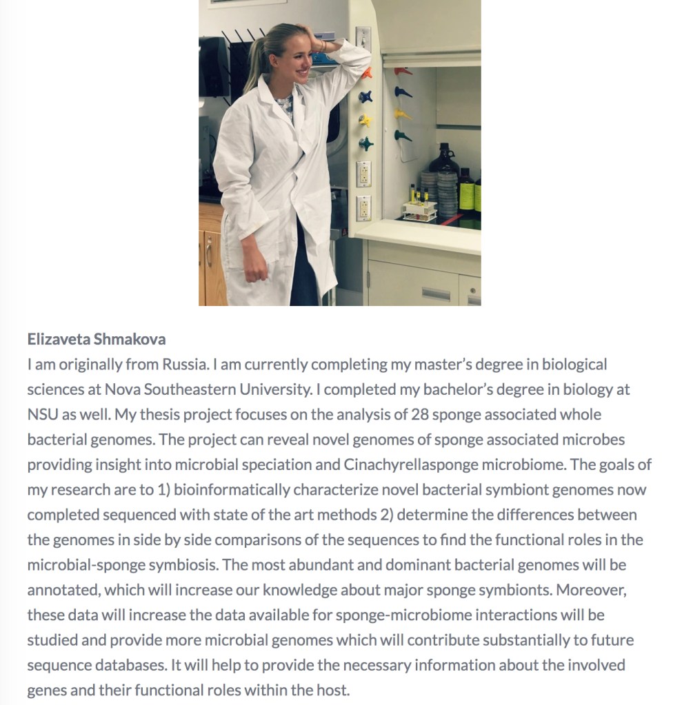 Rachel Bacaner – I earned my B.S. in Biology from Florida Atlantic University. While at FAU I was fortunate to participate in undergraduate research with Dr. Sarah Milton on the effects of temperature on cognitive behavior in Loggerhead Sea turtles. In addition, as an undergrad worked on the ongoing research of Dr. Xing-Hai Zhang, which focused on the detection and monitoring of the citrus green disease-causing bacterium using genetic analysis of plants. I am currently at NSU working towards my MS degree in Biological science (research concentration). My thesis research which will focus on exploring the molecular framework of cell culture and regeneration in soft corals using cnidarian model organisms. This research will aim to isolate cells, establish cell lines, and identify regeneration genes using comparative genomics. My project will also apply and contribute to the genomic data from the Aquatic Symbiosis Genome project. I am also working as a graduate research assistant on a project with the FL Dept of Environmental Protection with Dr. Lopez and PI Dr. Mark Butler from FIU. This project focuses on the role of sponge filtration in transforming coastal water quality in the Florida Keys. This project will involve assessing changes through molecular taxonomy analyses using 16S gene sequencing and more.