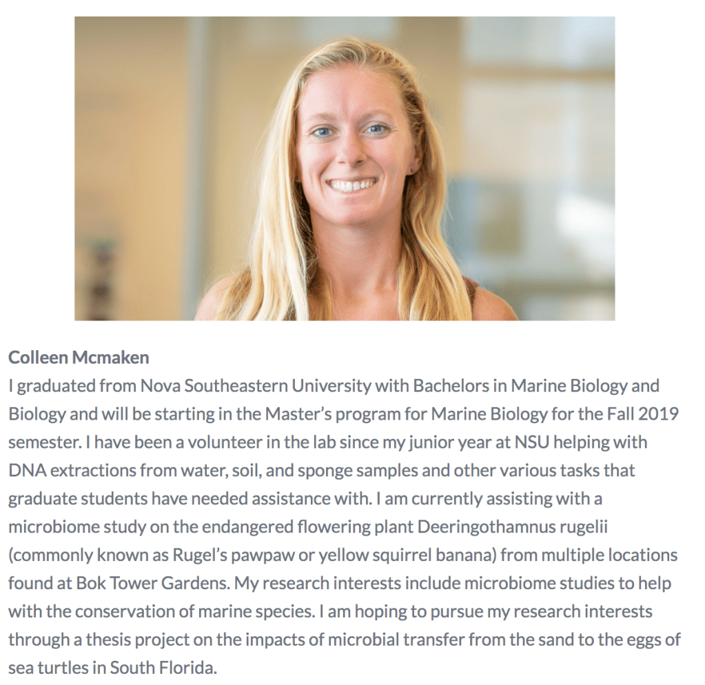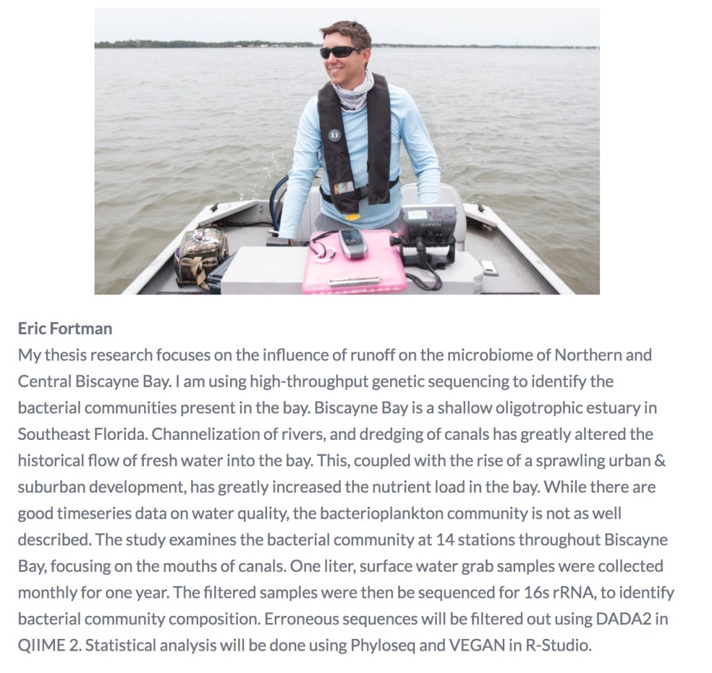 Stacy Brown – After graduating from NSU with a Bachelor’s degree in Marine Biology, I have been working in various operations positions in the Non-Profit field and most recently began establishing a community coral nursery and oyster garden with several non-profits in Broward where I serve as a Board Member (Urban Farming Institute, South Florida Association of Environmental Professionals, Reef Discovery Center). I am currently completing a master’s degree in biological science with a research concentration and joined Dr. Lopez’s Lab to learn more about the importance of microbiology and genomics in restoration efforts. My current thesis research involves studying the microbiome of South Florida Eastern Oyster populations. Local populations of Crassostrea virginica will be surveyed and mapped with Geographic Information System (GIS) along the New River, Middle River, and Cypress Creek of Broward County and along Oleta River in Miami-Dade. Microbiome analysis and species identification will be conducted with high throughput DNA sequencing with Illumina MiSeq16S rRNA protocols. I am hopefully that through my current research, in the near future, local oyster reef restoration projects will result though community input and citizen science efforts.