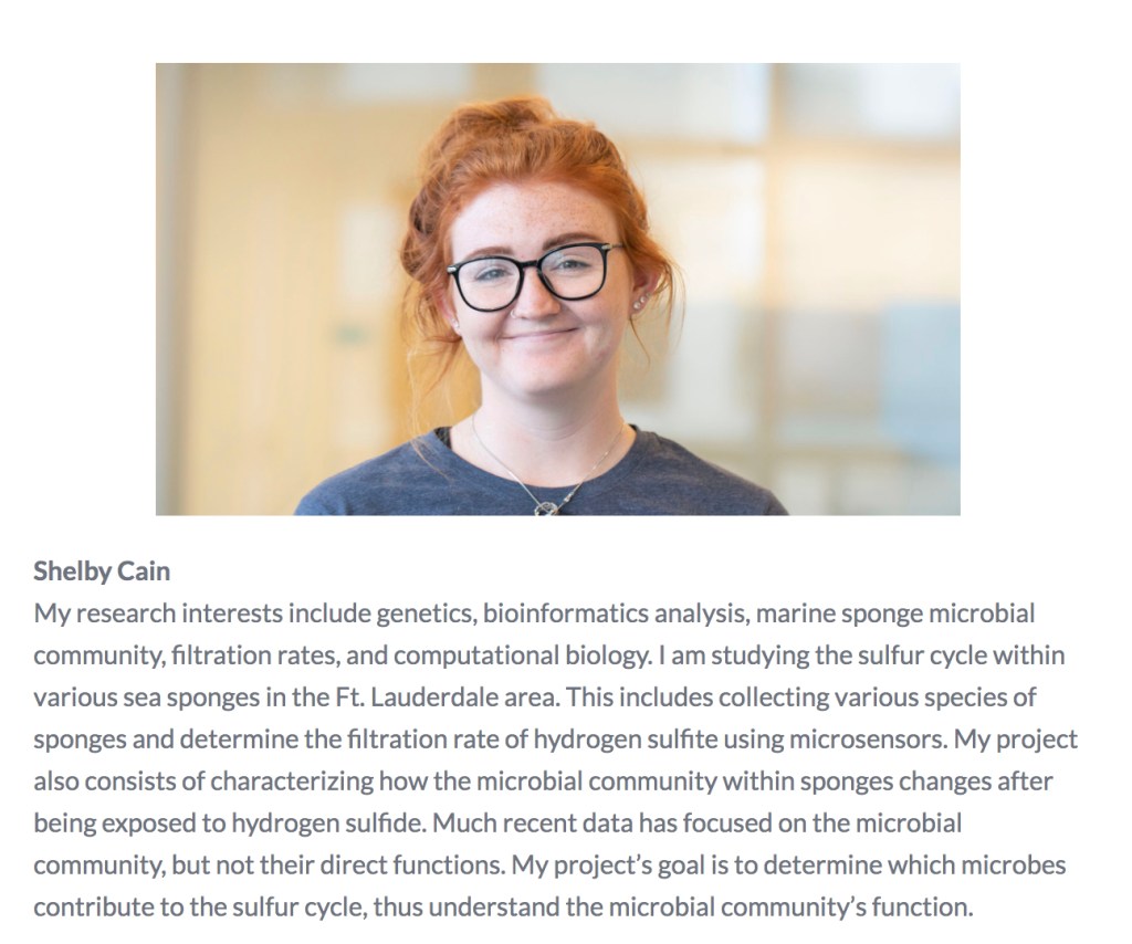 Past: Bachelor of Science in Marine Science with a minor in Biochemistry; Kutztown University of Pennsylvania Project: My project uses high-throughput sequencing techniques to analyze the microbiome present in Port Everglades Inlet. Port Everglades Inlet is one of the most active cargo ports in the United States and is the main seaport in southern Florida for petroleum products. The port is subject to a high volume of boat traffic and other human influences, making it a possible point source of pollution to the surrounding coastal waters. This study aims to use high-throughput sequencing to determine the composition of the microbial communities present in the port and their changes over a year, understand how water chemistry changes may correlate with changes in the microbial composition, and determine which harmful human and marine pathogens are present in the port. If this study is successful it will provide a baseline of the microbial species present in Port Everglades Inlet. This is important because of the high implications that Florida’s ports are point sources of pollution to the surrounding, sensitive coastal environments. The need for water quality monitoring of the inlet is of great importance, and this study will provide a novel, more complete profile of port microbes and potential pathogens that should be more routinely monitored during water quality tests.