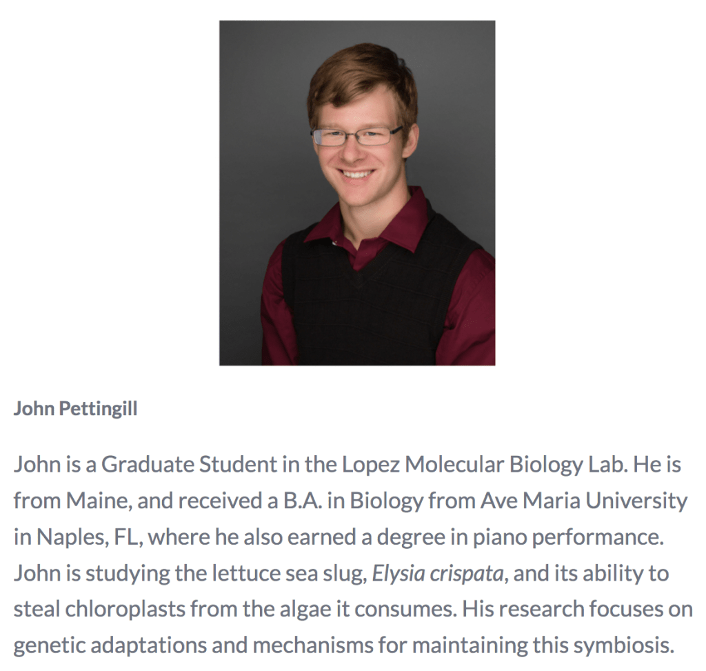 B.S. Biological Sciences, Florida State University(Minor: Chemistry)Thesis: For my thesis, I am looking at nuclear genome size diversity among multiple marine invertebrate taxa. Genome sizes provide researchers with an additional evidence for estimating evolutionary speciation rates through the relative changes in genome sizes within certain taxonomic groups, give genomics collaborators potential candidates for genome sequencing, and can elucidate the underlying foundation of the C-value paradox, the anomalous relationship between genome size and organismal complexity. Through the use of flow cytometry, nuclear genome size can be estimated via the fluorescence intensity of a DNA-binding dye. This thesis project is a result of the goals set forth by the Global Invertebrate Genomics Alliance, a consortium aiming to foster more genomic research of non-insect and non-nematode invertebrate species. Learn more…